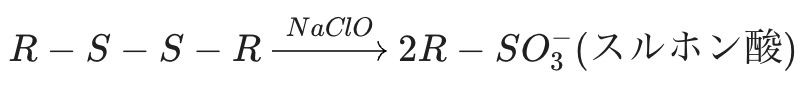 髪の毛がなぜあんなに丈夫なのか知っていますか?それは、タンパク質の鎖同士が「硫黄」を介してガッチリ握手しているS-S結合(ジスルフィド結合)、架橋構造があるからです。塩素系洗剤はこの「握手」さえも酸化の力で引き剥がします。