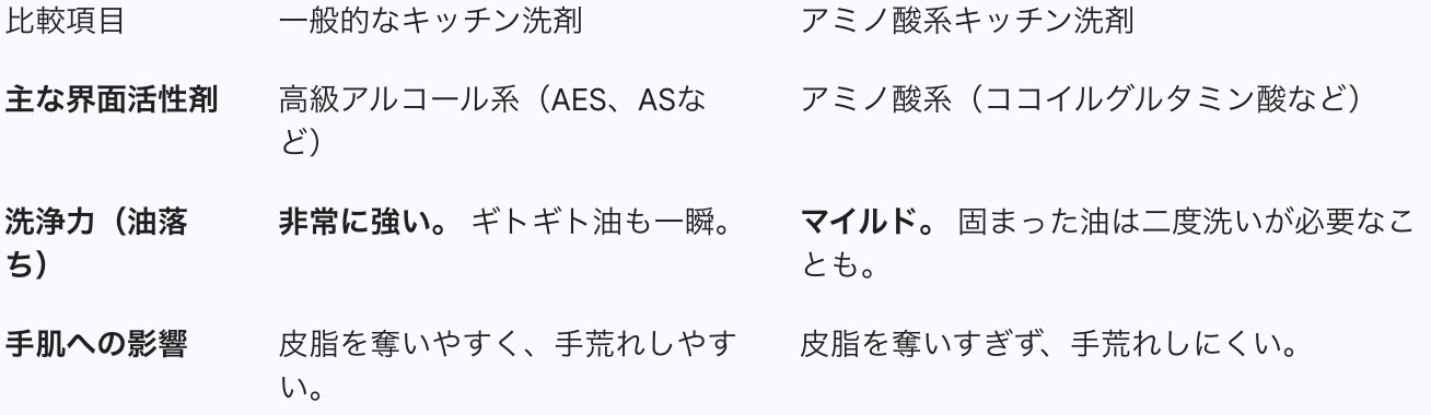 アミノ酸系洗剤は中性なのですが、これは基本的に界面活性剤を使っているのでキッチンの中性洗剤としく変わりません。ただし洗浄力が少し弱く、逆に言えば肌に優しいという面があります。