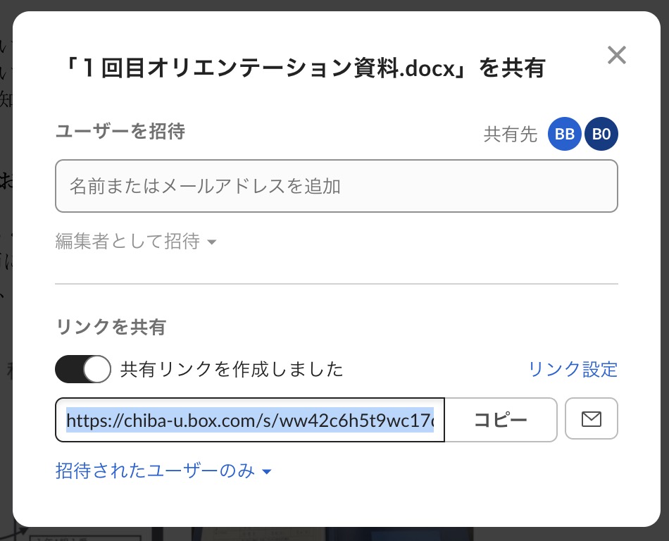 - 「コラボレーターを招待」欄に、共有したい先生のメールアドレスや名前を入力します。またはリンクをコピーします。