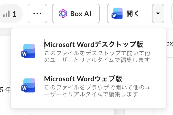 - Box Driveからファイルを選んでダブルクリック、またはブラウザの「開く」から「デスクトップアプリ」を選択します。