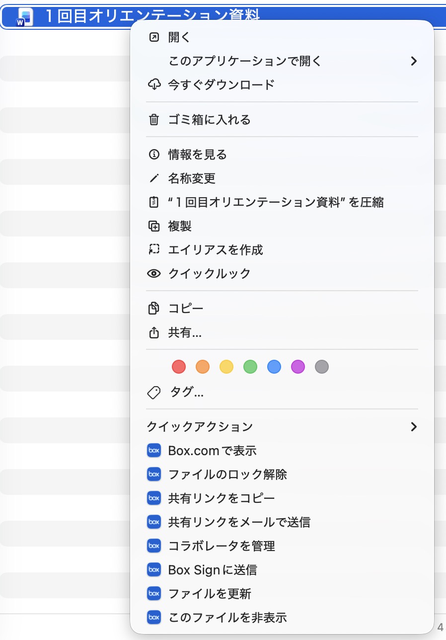 この状態でデスクトップのBoxDrive上のアプリを右クリックすると、Box専用の色々なメニューが出てきて便利です。