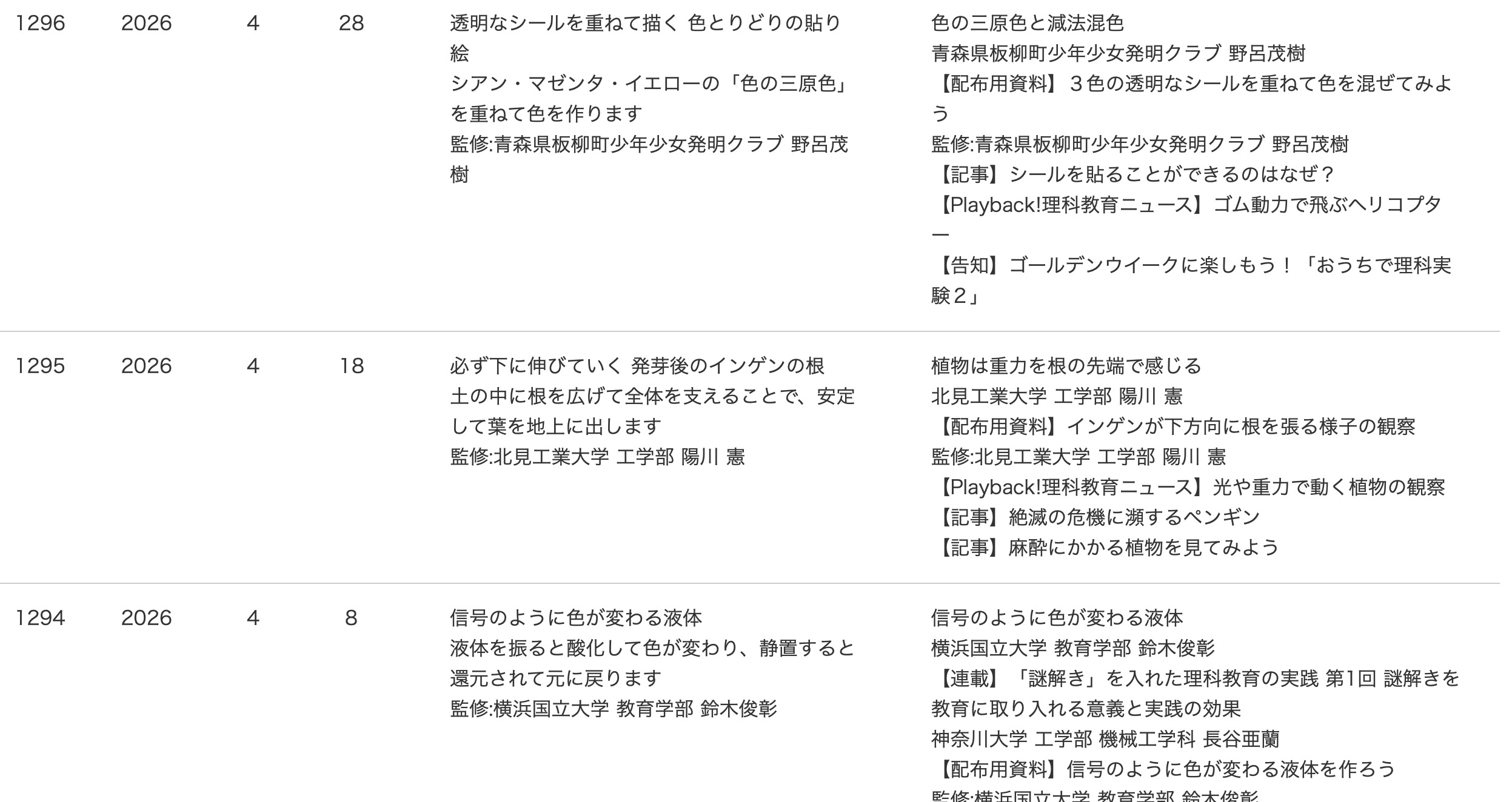 「もっと早く見たい!」という方は、ぜひこちらのリンクから過去のラインナップを覗いてみてください。過去の理科教育ニュースのテーマはこちらです。思わず「へぇ〜!」と声が出てしまうような、興味深いタイトルがずらりと並んでいます。