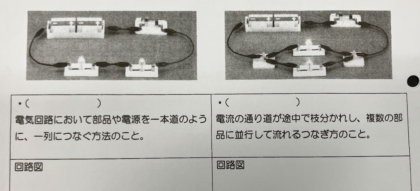 ここでようやく回路図記号の登場です。生徒たちに、自分の組んだ回路を整理して図に描いてもらいます(直列は私が書き方を説明しました。並列については生徒にやらせました)。すると、あることに気づきます。