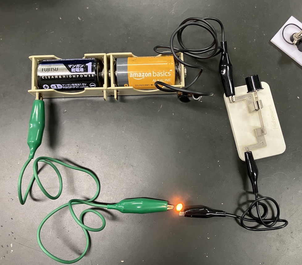 最後に、実際に回路図を書いて、じゃあこれを組み立ててみようという、回路図の読み取りも行いました。またLED電球を持ってきて、豆電球との違いについて実験をするなどをしました。LEDは光ときと、光らない時があるようです。