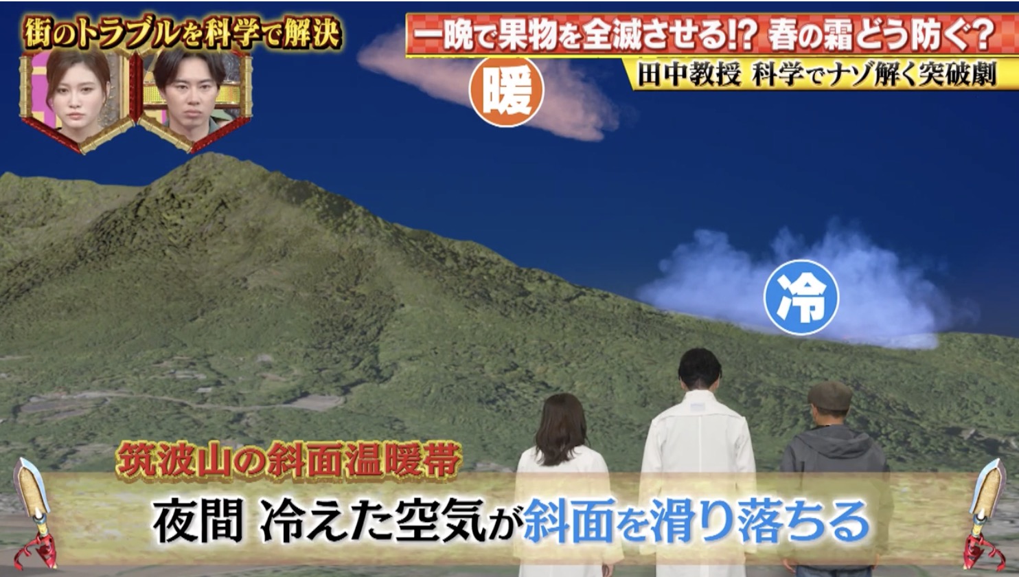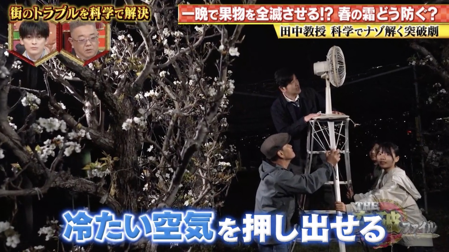 今回のテーマは凍霜害(とうそうがい)です。気温が氷点下まで下がり、霜が降りて果物や農作物がダメになってしまうという被害を、どうすれば防げるのか――田中教授がミステリーを解くように解決策を探っていくコーナーの監修を行いました。