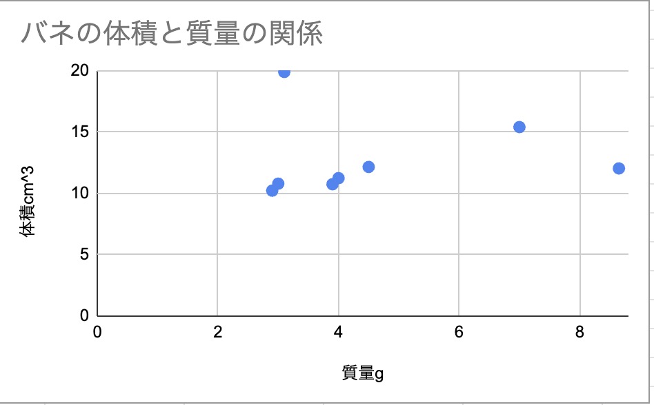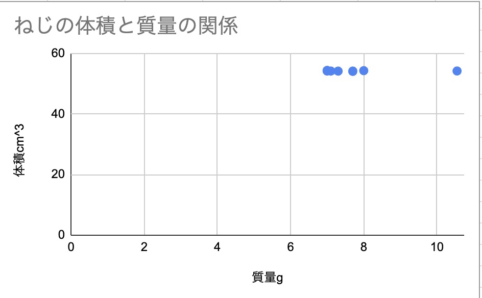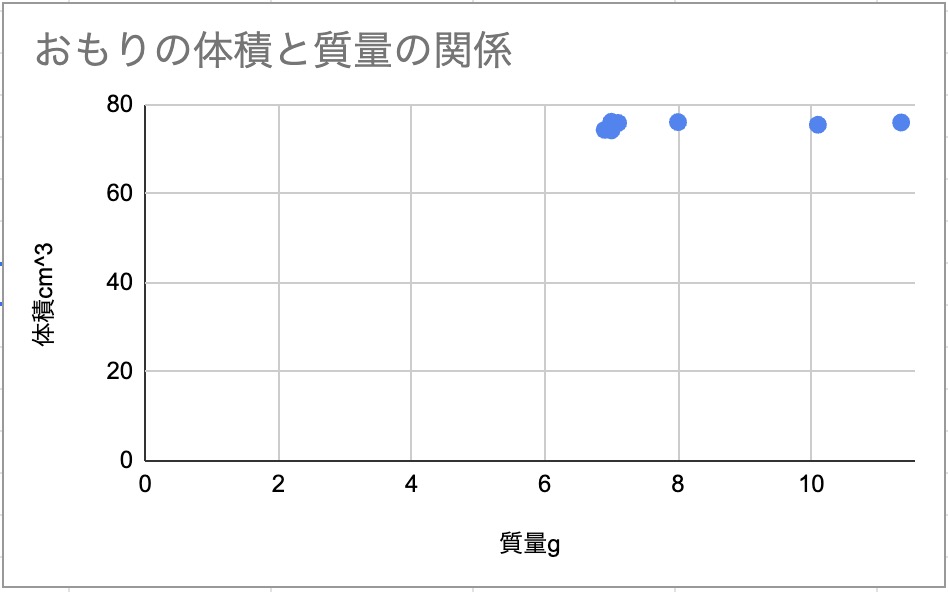 しかし、一つの班だけのデータでは、「たまたまそうなっただけでは?」という疑いが残りますし、測定には必ず誤差が含まれます。そこで、クラス全員の出番です。 全班の結果を持ち寄り、縦軸に「質量」、横軸に「体積」をとってグラフにプロットしていきます。