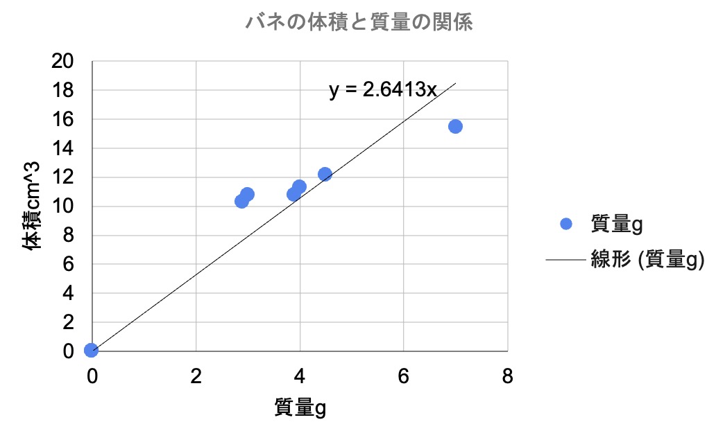 この直線の「傾き」こそが、その物質の密度を表しています。 「自分たちの班のデータは少しずれていたけれど、クラス全体で見るとこの線に乗っている!」 この瞬間、生徒たちは「誤差」を超えて、物質が持つ普遍的な性質(=密度)を視覚的に理解します。