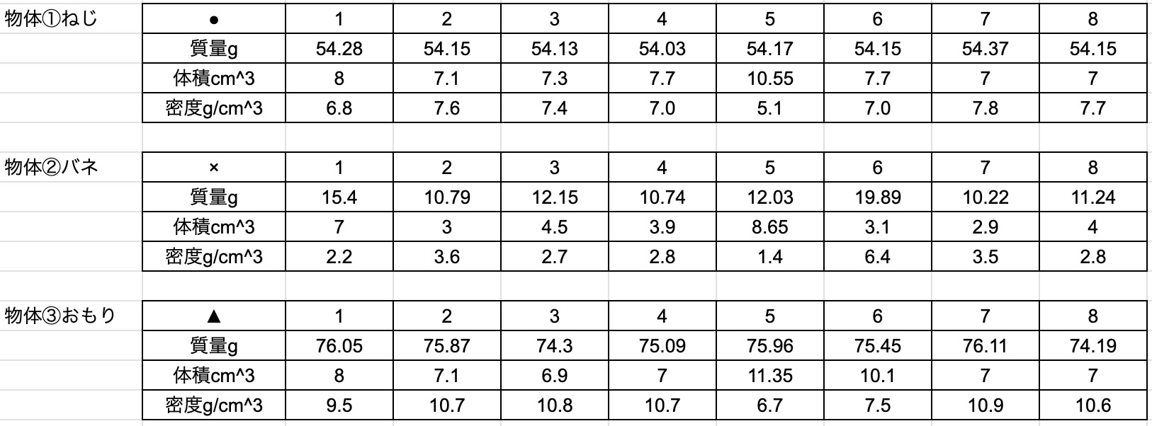 この指紋を照合するために、生徒たちは以下の手順でデータを集めます。電子天秤を使って「質量」を測る。メスシリンダーを使って「体積」を測る。「質量 ÷ 体積」の計算をして、密度を求める。シンプルな手順ですが、ここには科学実験の基本がぎっしりと詰まっているのです。